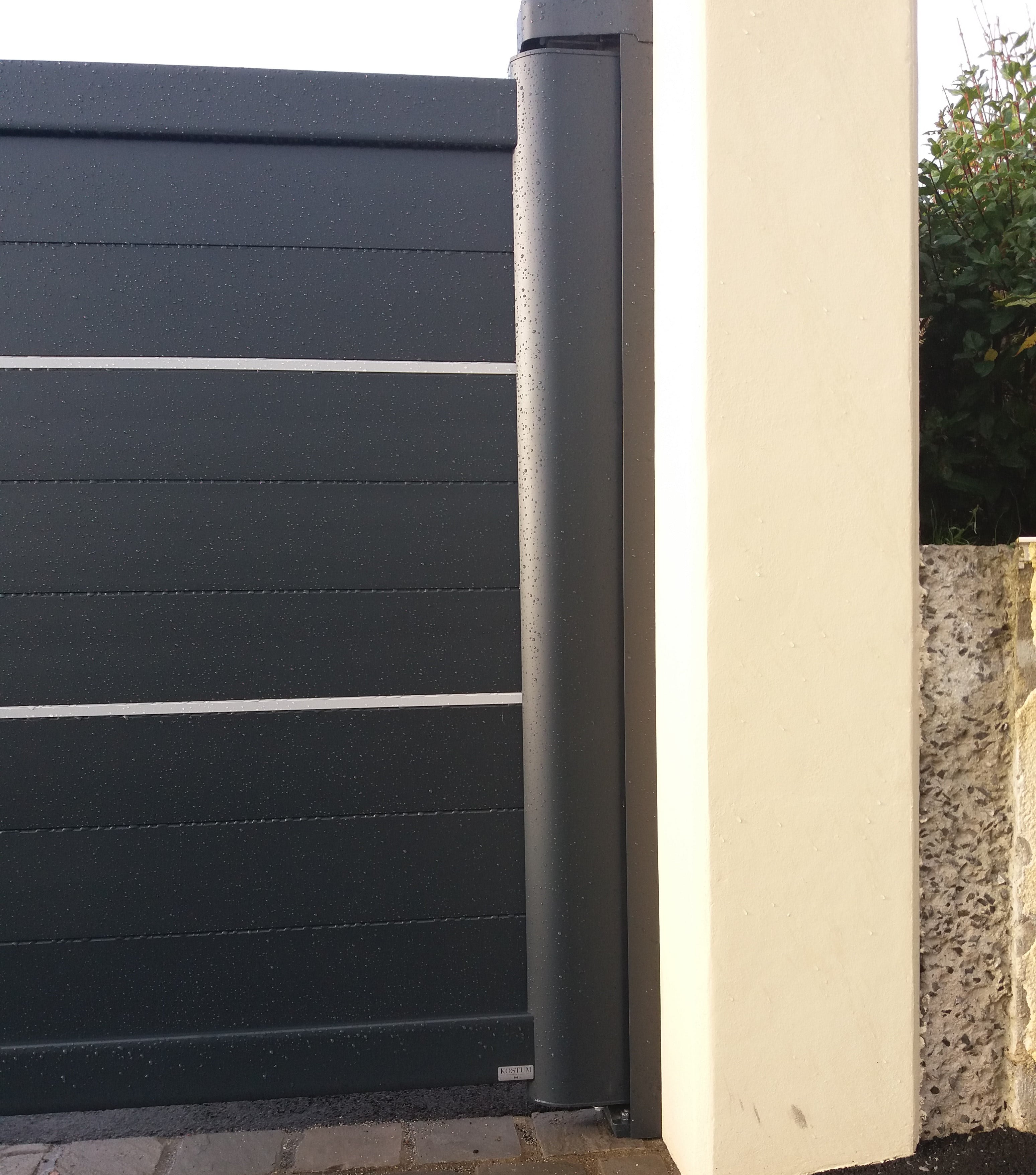 Le modèle sélectionné est Anaé de la gamme Kostum, un sur-mesure du fabricant breton. Il s’agit d’un portail électrique en aluminium aux lignes contemporaines, avec un coloris gris anthracite très tendance.